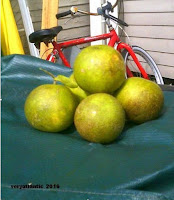 Here you have what I think are pink grapefruits from my back yard. I say I think, because the tree has the blight and the fruit never ripen. I picked these low-hanging specimens to see if I can coax them into ripening indoors. The fruit is extraordinarily sour, but edible.