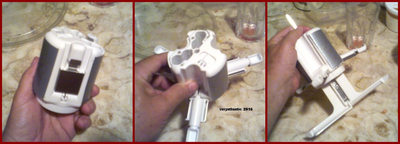I have another mystery picture for you. What is this? The logo is covered with duct tape so you can’t guess by that. Here is the basic unit in closed, open, and assembled conditions. If you’ve seen one before, you’ll know right away, but I’ve never seen one. It might be, for all I know, a very common item on television. I was just going to give you the left photo, but these are blurry Vivitar photos, so you get three different poses.