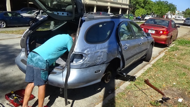 You will want to know how the car repair is going. As well as expected. The car will not be repaired the way we are proceeding, but it will soon look much nicer. It’s labor intensive, shown here is Agt. M (the club vice-president) working in the hot sun. His wife said no inside work, againt the virus thing. This is near the end of the work, with the bumper back on and most of the metal pushed out from the inside.