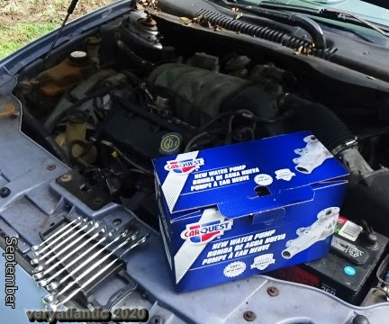 The other neighbor, who is from near Carthage in TN, got stranded with his kids due to a motor breakdown. Knowing this was fresh in his mind, I hired him to help me with the water pump. He was late getting here, by which time I had removed around thirty bolts holding brackets and moving things out of the way. He got at the final few bolts that were a bitch to get at, thanks, Ford. Last two bolts taking 90% of the time.